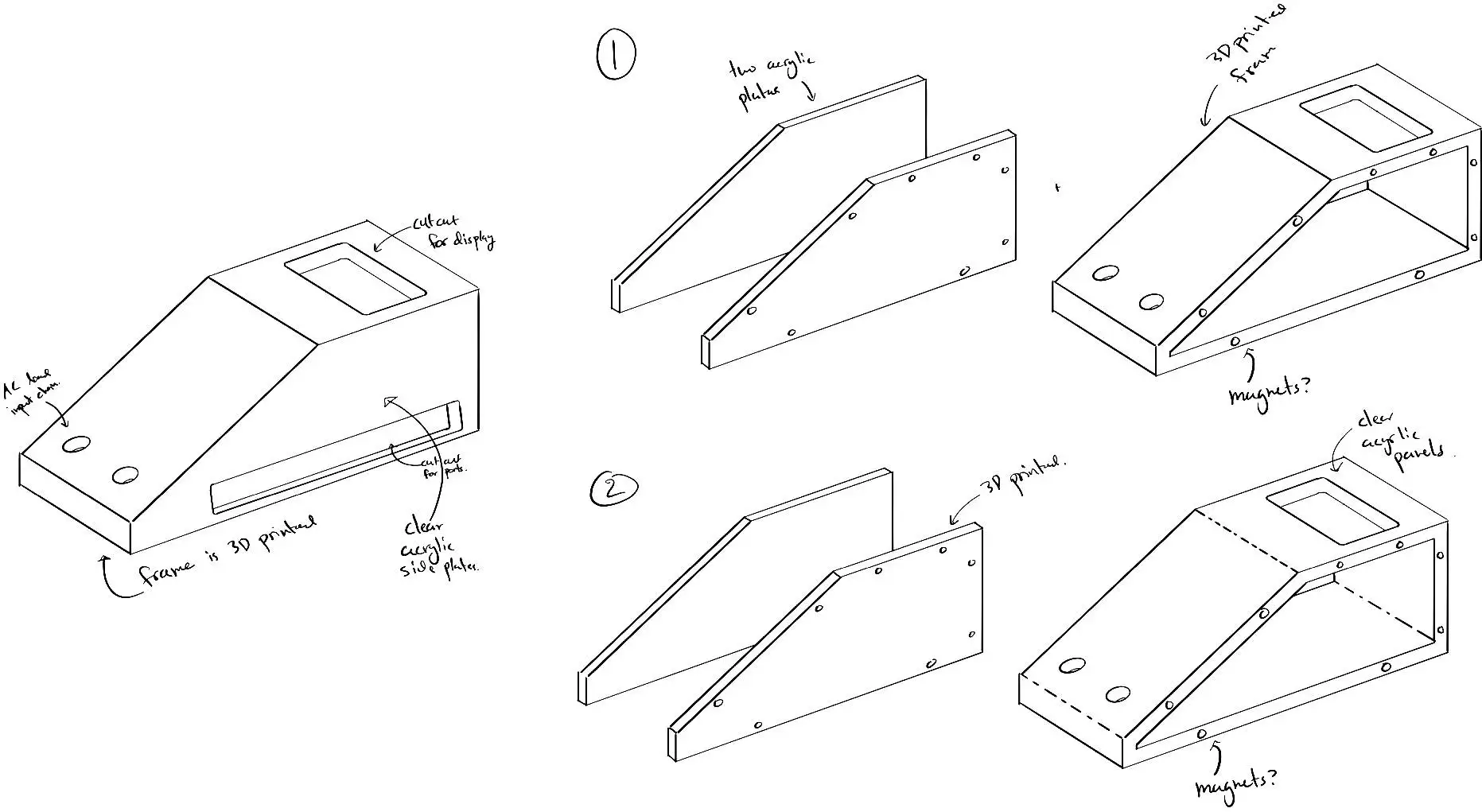 The sketches show our thinking - we wanted the display visible and angled for easy reading, ports accessible from the side, and (importantly) the ability to show off the PCB through clear panels.