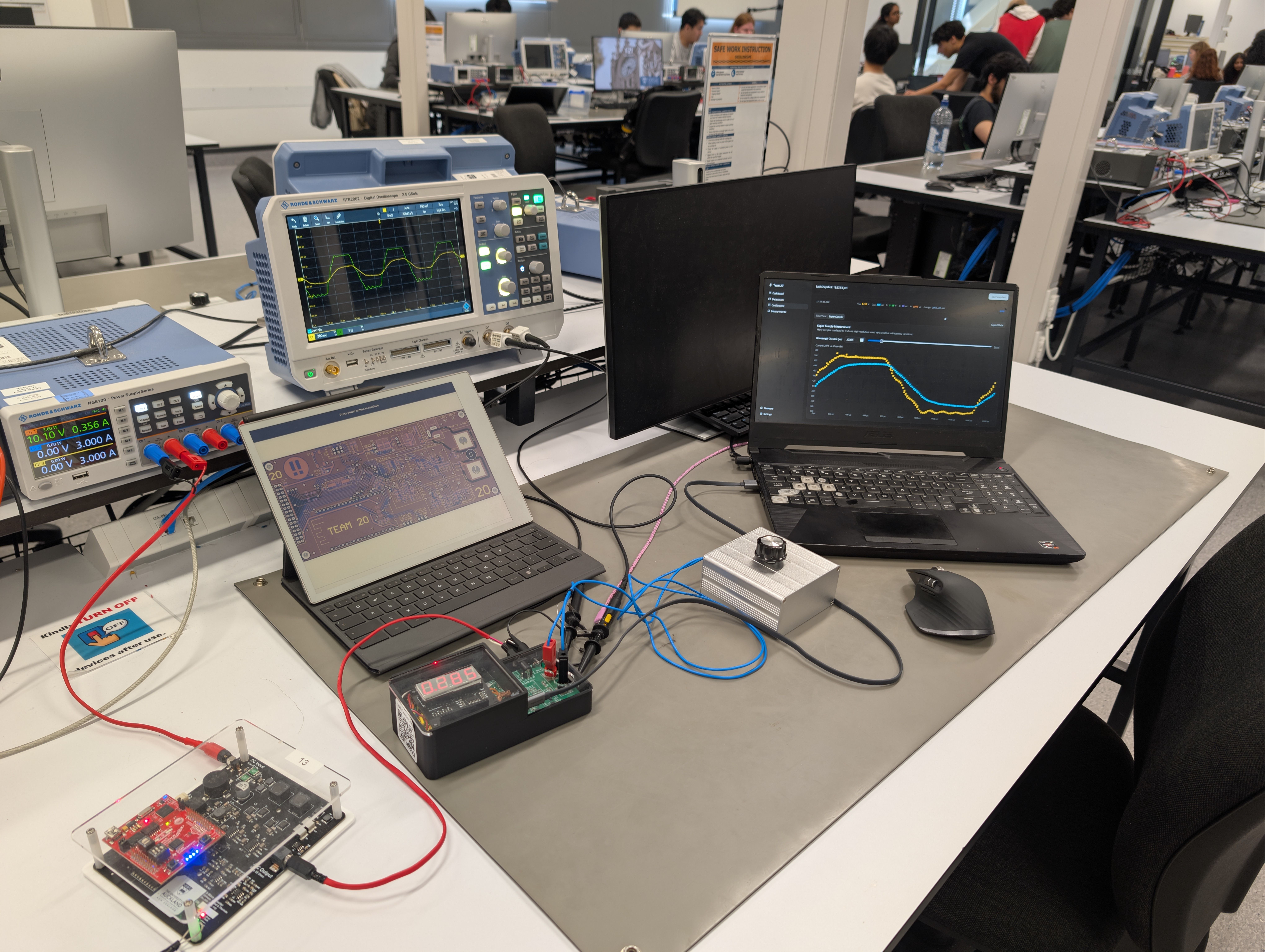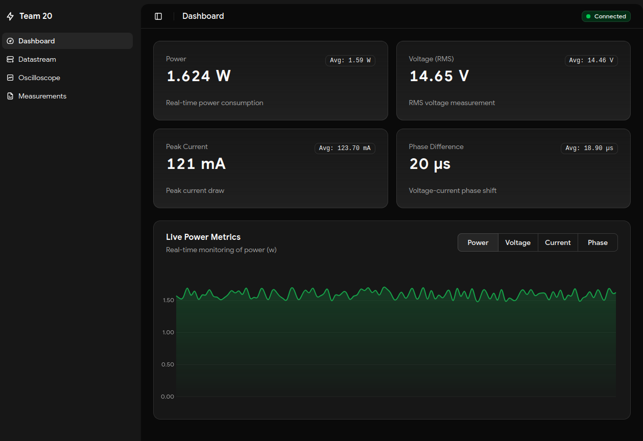 When you connected to the “Team 20” WiFi network, your browser automatically opened to our dashboard. No app store, no installation, just instant access to real-time power data, oscilloscope views, and firmware updates. It was the kind of seamless experience that makes you forget you’re talking to a 2MHz microcontroller measuring fictional appliances.