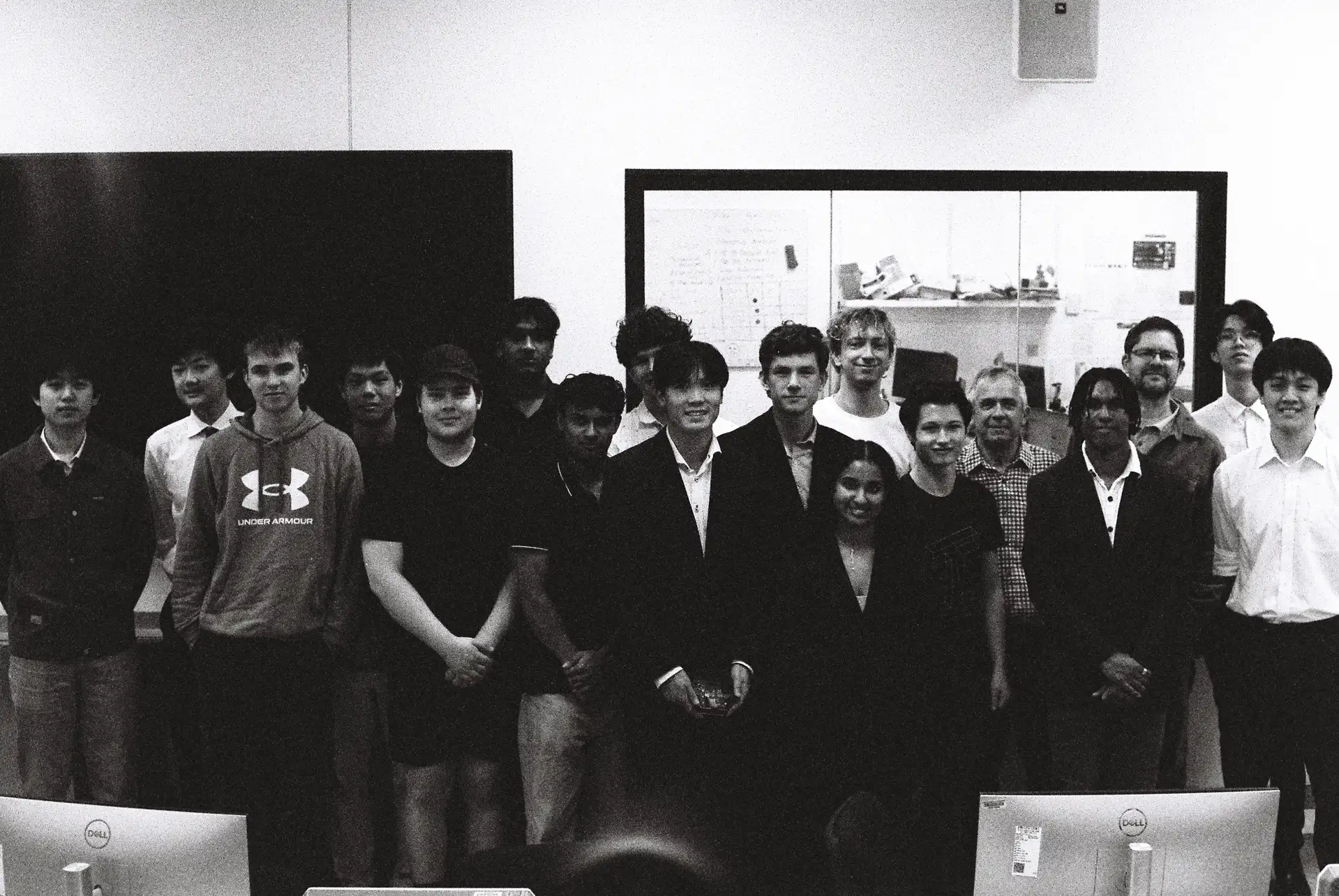 The final build used a textured black PLA frame with laser-cut acrylic on the top and bottom. The 3D printed standoffs at the corners tied everything together, and the bottom panel got the full treatment: team branding, member names, and a custom logo.