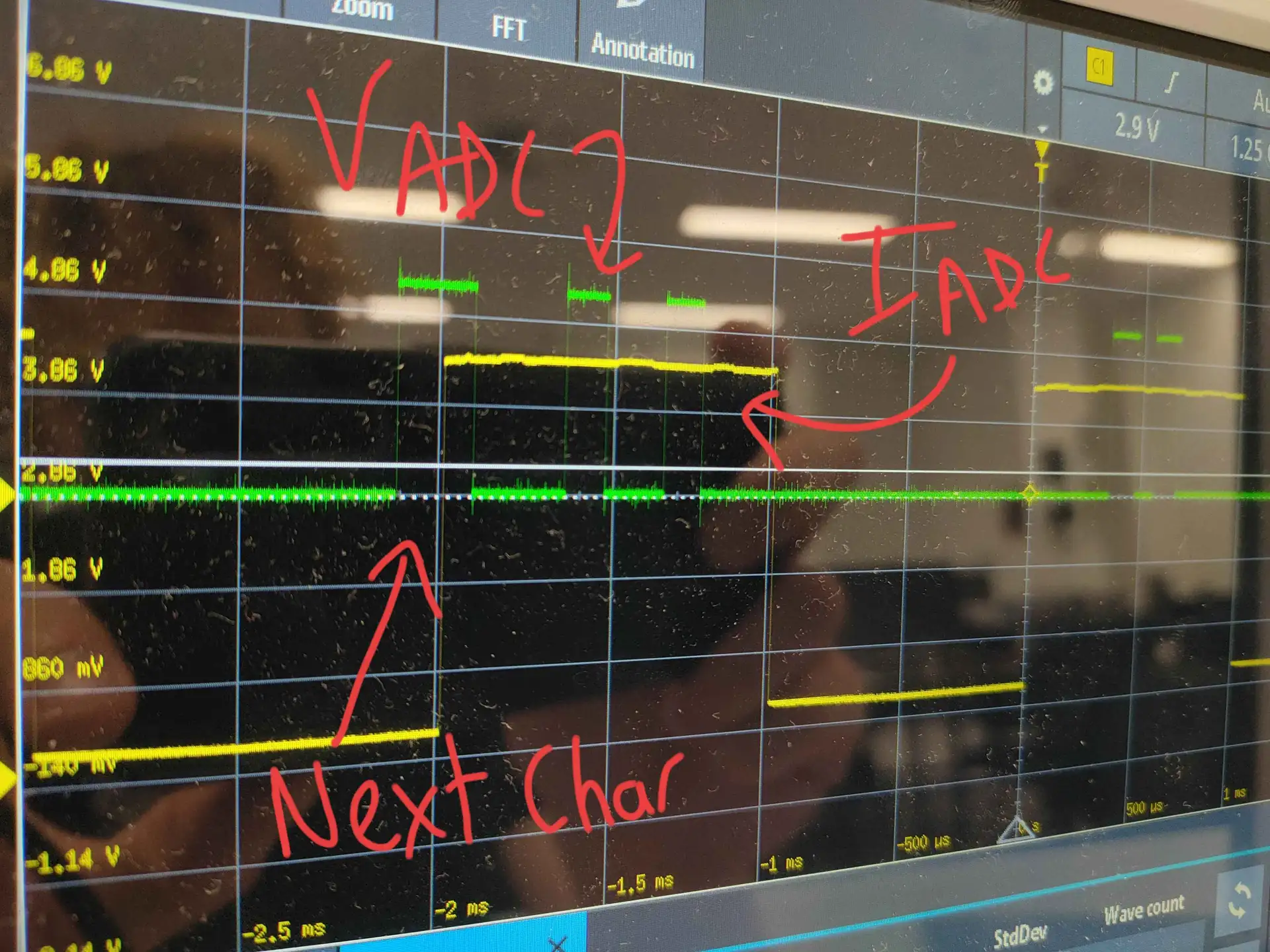One of our most frustrating debugging sessions came from an unexpected source: the 7-segment display. The oscilloscope told us exactly what was happening.