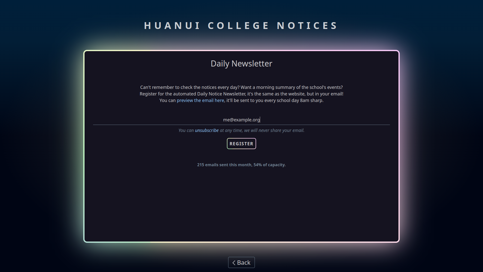 Some people want a reminder about the daily notice in their inbox, so they can now signup for the automated daily email with the newsletter content. This is rendered every morning in a custom MJML and sent out with MailJet’s free tier. That free tier has a pretty low sending cap, so the signup page also includes subscriber stats, and stops new signup’s at 95% capacity.