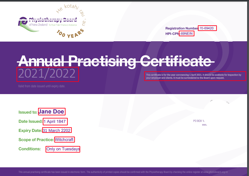 At it’s core, it’s a typescript library that can read selected fields from the Annual Practising Certificate (PDF document) issued by the Physiotherapy Board. This is a tiny library, but this parser is a proof of concept for a future library that would have wide support for many different medical certificates.