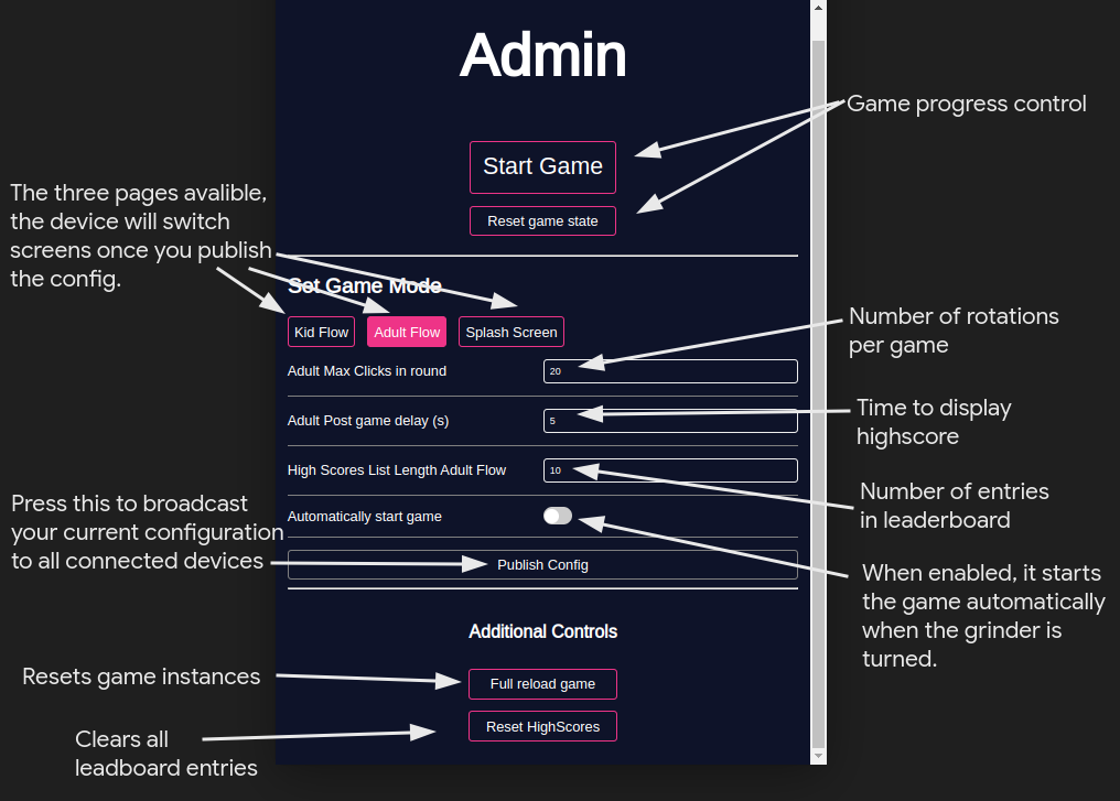 The admin page can be opened on any nearby device connected to the management hotspot. In the admin portal, you can start the game, configure settings, and change game flows.