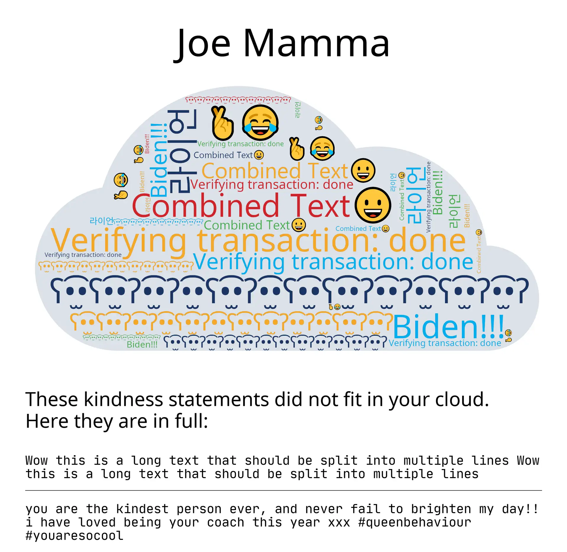 - Using a modified version of wordcloud.py for full-colour emoji support, generate a themed wordcloud image with everyone’s shorter statements